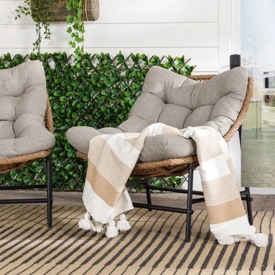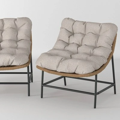 Design a stylish outdoor space with these patio chairs from Saracina Home. In a transitional style these outdoor chairs will make the perfect addition to your deck, porch, patio, or backyard. Each made for maximum comfort, so you lounge back and soak up the sun or read a book. Made in a mixed material design with a tufted, upholstered seat, rattan edging, and aluminum metal legs for an overall comfortable and durable design. Both UV and water resistant, making them ideal for outdoors. This chair set is lightweight so you can easily pick up and move them to whichever area of your backyard you prefer, whether to combine with other patio furniture for family parties or in the shade away from direct sunlight.