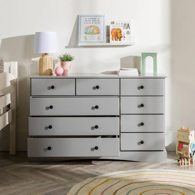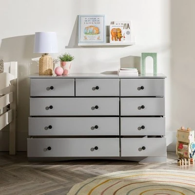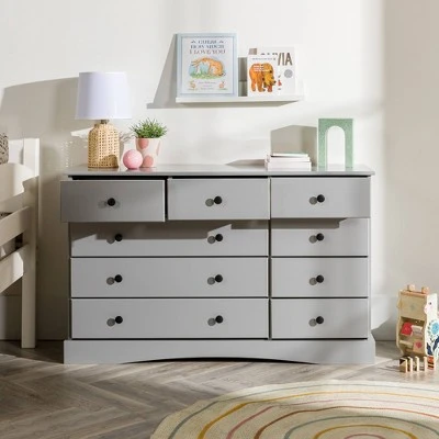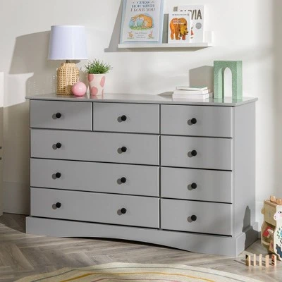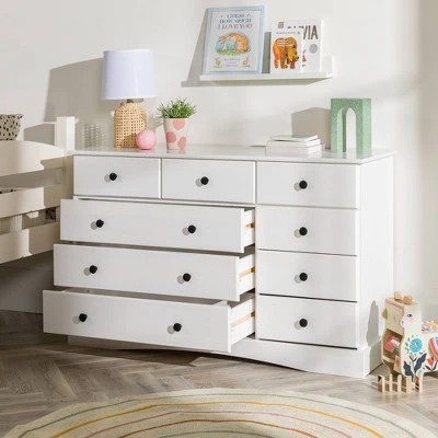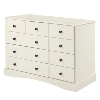 Situate Saracina Home’s Lauren Classic Transitional 9 Drawer Storage Dresser in your bedroom to expand your storage potential. Three large drawers and six smaller drawers make it easy to compartmentalize the contents, from socks to linens. The adaptable, transitional style looks just right in a child’s bedroom or a classic master suite. Responsibly-harvested solid pine and sturdy MDF materials promise a long-lasting storage console. Black metal hardware complements the smooth painted finish to make your home look neat and put together. For a complete bedroom set, pair with the Lauren nightstand.