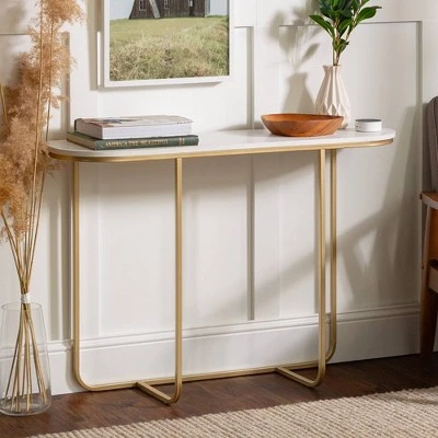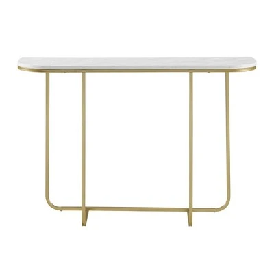 Revamp your living room or entryway with Saracina Home’s Megan Modern Glam Curved Console Table. The sturdy MDF wood tabletop core is finished with durable laminate and supported by painted metal legs for a durable, classy design. Place carefully chosen keepsakes on the top for a sophisticated minimalist vibe, or pack it with lush house plants to keep things fresh. With the rounded table edges and legs, this contemporary sofa table has curves in all the right places.