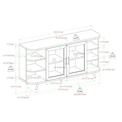 Warm light grazes the soft edges and glances off the glass doors of Saracina Home’s Mid-Century Modern Double Door Curved Sideboard. The storage console’s rounded edges lend a welcoming, organic silhouette to complement a contemporary living room, contrasted by the angled metal legs. Four fixed shelves, two on each side, beckon eclectic décor or entertaining essentials. Two fluted tempered safety glass cabinet doors offer texture to the buffet and tastefully hint at what’s inside. Swing open the soft-close doors to reveal two adjustable shelves that can be moved up and down to accommodate books, place settings, or games. Two cord management ports even make this multi-use piece perfect as a TV stand for TVs up to 65 inches.