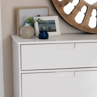 Organize your clothing and accessories in style with this 6-drawer dresser from Saracina Home. With storage deep drawers, this wood dresser provides plenty of storage area for small space living. Including six drawers, with the top two in a smaller composition for socks and accessories. Easily access your items with the unique, cutout handles that add to the mid century modern and transitional design style. With angled legs, this dresser is made of solid pine wood in a stained finish to showcase the wood grain texture. Position next to a wall in your bedroom or guest room.
