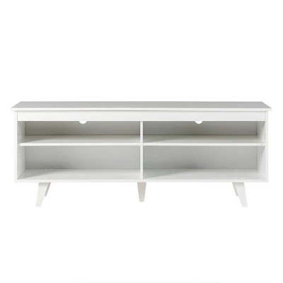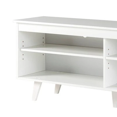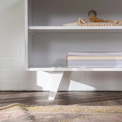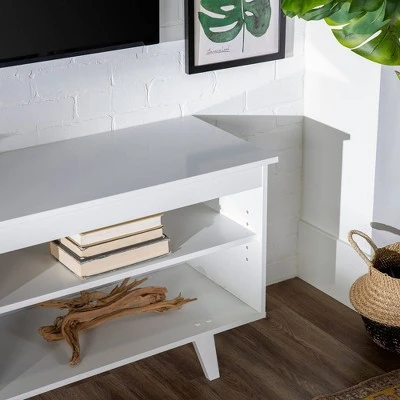 A chic, minimalistic console for the perfect combination of design and function—you’ll be sure to fall in love with the Modern Contemporary Simple Wood TV Storage Console by Saracina Home. The versatile, open design is the perfect solution for all your entertainment stand needs. The two adjustable shelves can hold all your devices or showcase books and knick-knacks, and two cord management ports ensure that your tech will stay organized. The sleek construction and modern, angled legs make for a classy statement piece that commands center stage in your living room.