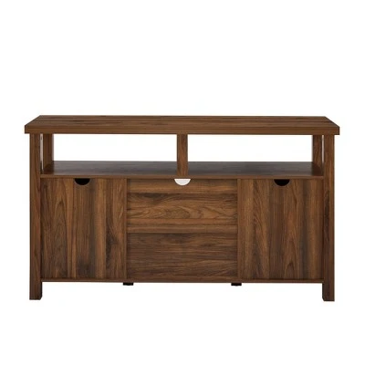Bask in the relaxing presence of the Modern Farmhouse Highboy Double Grooved Door TV Stand by Saracina Home. Two cabinet doors with beadboard panels add texture to your living room and give the entertainment console its southern beach vibes, all while keeping clutter out of sight. The tall unit’s added upper shelf and open center compartment are perfect for displaying a carefully curated collection of electronics or trinkets. Thanks to three adjustable shelves and cord management ports, this media stand can accommodate a variety of media setups.