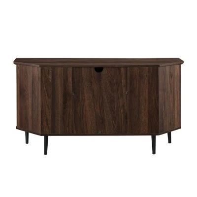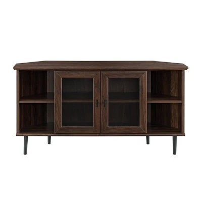Incorporate a timeless piece that will last for years to come with Saracina Home’s 48″ Modern Glass Door Corner TV Stand. This console features lifted metal legs for modern sensibility to the transitional silhouette. Two doors with clear tempered safety glass fronts let you keep an eye on the media components that you place on the adjustable middle shelf, while four cord management ports keep your cables organized. The convenient angled design means it can fit into any corner of your home, so you can arrange and rearrange to your heart’s content.