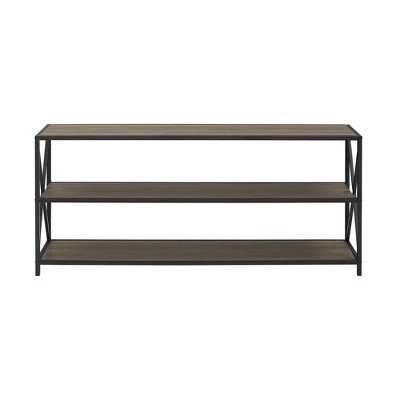 Whether you want to add a masculine element to your bohemian inspired space or capture the spunk of a raw-material look, this Modern Farmhouse X Frame Metal and Wood Media Bookshelf from Saracina Home can deliver on your design dreams while increasing your storage capabilities. with four open shelves, this 64-inch storage unit functions as a bookshelf, media tower, or display shelf. Unit accents include: lateral metal bars, angled brackets, and a thin metal X detail. Plus, this industrial piece comes with wall-fastening for extra stability so if your house is the party place, you and your friends can bust a move worry free.