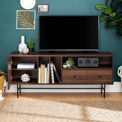 Need a spot for your records? Check. Looking for closed storage? Double check. Want a versatile unit that could double as a sideboard or a TV stand? Check, check, and check. Saracina Home presents, the 60” Modern Vertical Storage TV Console. This media stand offers a cupboard to hold all your electronic goodies as well as three open storage cubbyholes. Two of the three cubbyholes are tall and thin, perfect for you most treasured records. A single drawer—dressed up as a faux set of double drawers—runs along telescoping metal glides for smooth movement. Powder-coated steel hardware forges this media console’s handles and legs. Worried about your electronic cords coiling this way and that? Check, again! Cord management ports are available to keep your TV stand neat and trim.