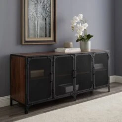 Urban Industrial Metal Mesh 4 Door TV Stand For TVs Up To 65″ Dark Walnut – Saracina Home