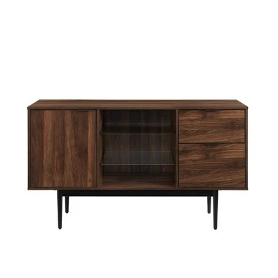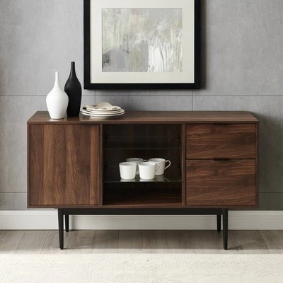 Organization comes in three ways with Saracina Home’s Timothy Modern Lifted Triple Storage Sideboard. An adjustable wood shelf within the cabinet gives you flexible closed storage, while two adjustable, tempered safety glass shelves put your décor center stage. Odds and ends can slide right into the two different-sized drawers. Soft-close cabinet hinges and smooth, telescoping metal drawer glides make using this contemporary buffet a breeze. A cord management port allows you to transition the piece into a TV stand for screens up to 58 inches.