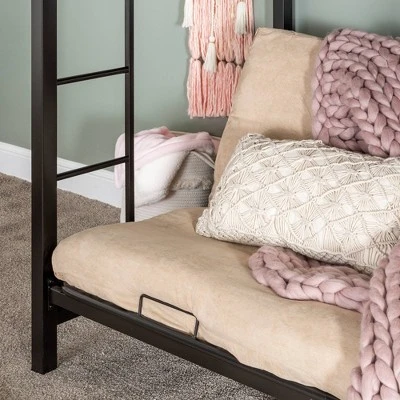 Your kids need more space in their bedroom, or they’ve outgrown a boring set-up. Revamp the fun and add some smart space design with Saracina Home’s Kids Twin Over Futon Bunk Bed. Its innovative, powder-coated steel frame allows for a transformative, versatile bedroom bed frame. Incorporated ladders and a lower futon mitigate bulk, while wrap around safety guardrails keep your little sleepers safe and sound. Your kids will enjoy the coolest sleepovers, video game nights, or sibling hangouts as the lower futon frame doubles either as an extra bed, or a cool couch! And best of all, metal slats mean no box springs are required. So, welcome home a nifty, space-saving bedroom makeover and enjoy the renewed, fun atmosphere.